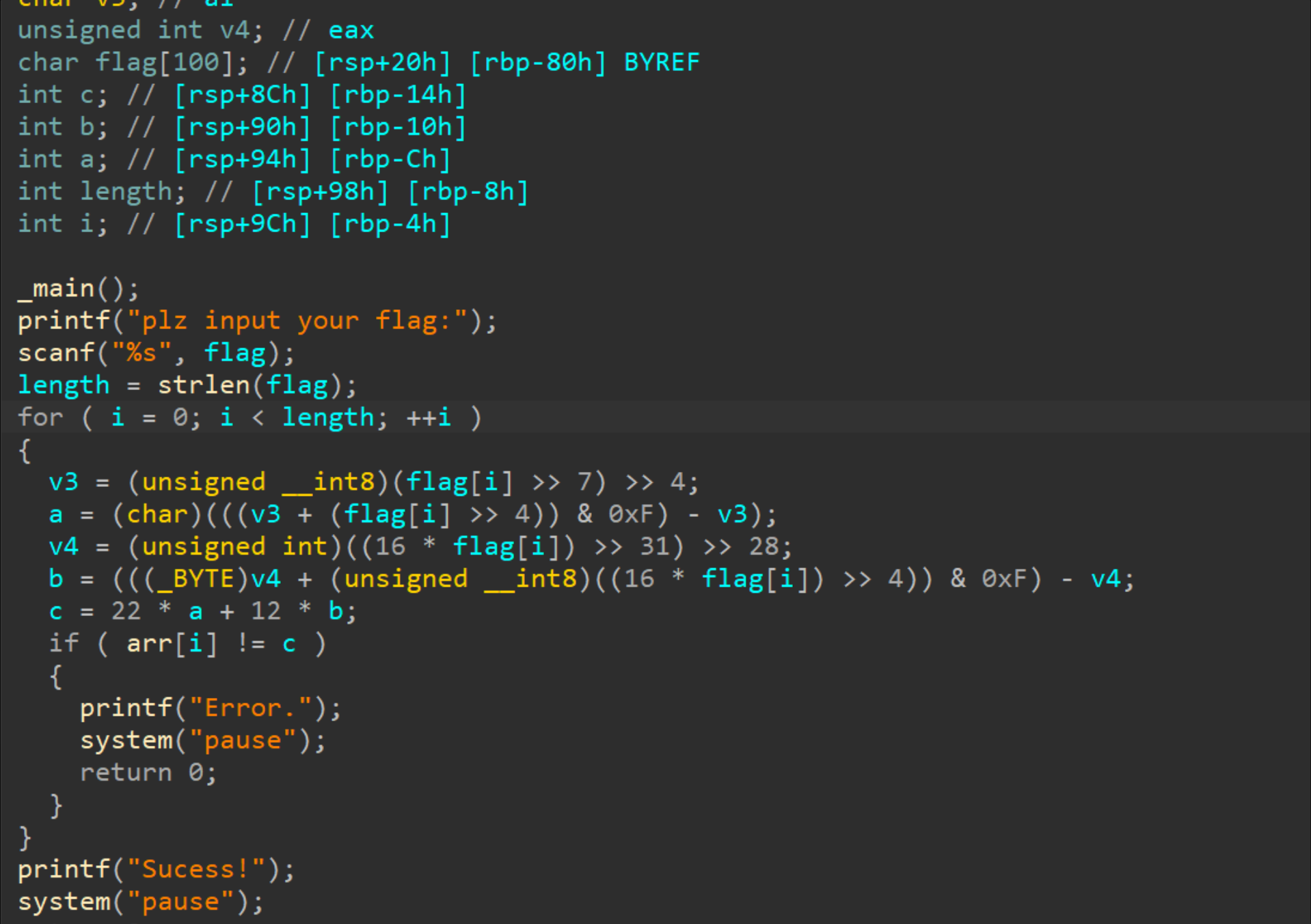 | data=[0x000000A0 , 0x000000E6 , 0x0000007A , 0x0000011E , 0x000000E6 , 0x00000090 , 0x00000122 , 0x000000D0 , 0x000000F0 , 0x00000090 , 0x0000012C , 0x000000D8 , 0x00000122 , 0x000000F4 , 0x000000F0 , 0x00000064 , 0x00000100 , 0x00000136] zd = ['a', 'b', 'c', 'd', 'e', 'f', 'g', 'h', 'i', 'j', 'k', 'l', 'm', 'n', 'o', 'p', 'q', 'r', 's', 't', 'u', 'v', 'w', 'x', 'y', 'z', 'A', 'B', 'C', 'D', 'E', 'F', 'G', 'H', 'I', 'J', 'K', 'L', 'M', 'N', 'O', 'P', 'Q', 'R', 'S', 'T', 'U', 'V', 'W', 'X', 'Y', 'Z', '1', '2', '3', '4', '5', '6', '7', '8', '9', '0', '!', '@', '#', '$', '%', '^', '&', '*', '(', ')', '-', '=', '+', '_', '{', '}', '[', ']', '|', '~', '`', ':', ';', '"', "'"] for i in range(87): zd[i]=ord(zd[i]) flag='' for j in range(18): for i in range(87): v3 = (zd[i] >> 7) >> 4 a = (((v3 + (zd[i] >> 4)) & 0xF) - v3) v4 = ((16 * zd[i]) >> 31) >> 28 b = ((v4 + ((16 * zd[i]) >> 4)) & 0xF) - v4 c = 22 * a + 12 *b if (c==data[j]): flag+=chr(zd[i])