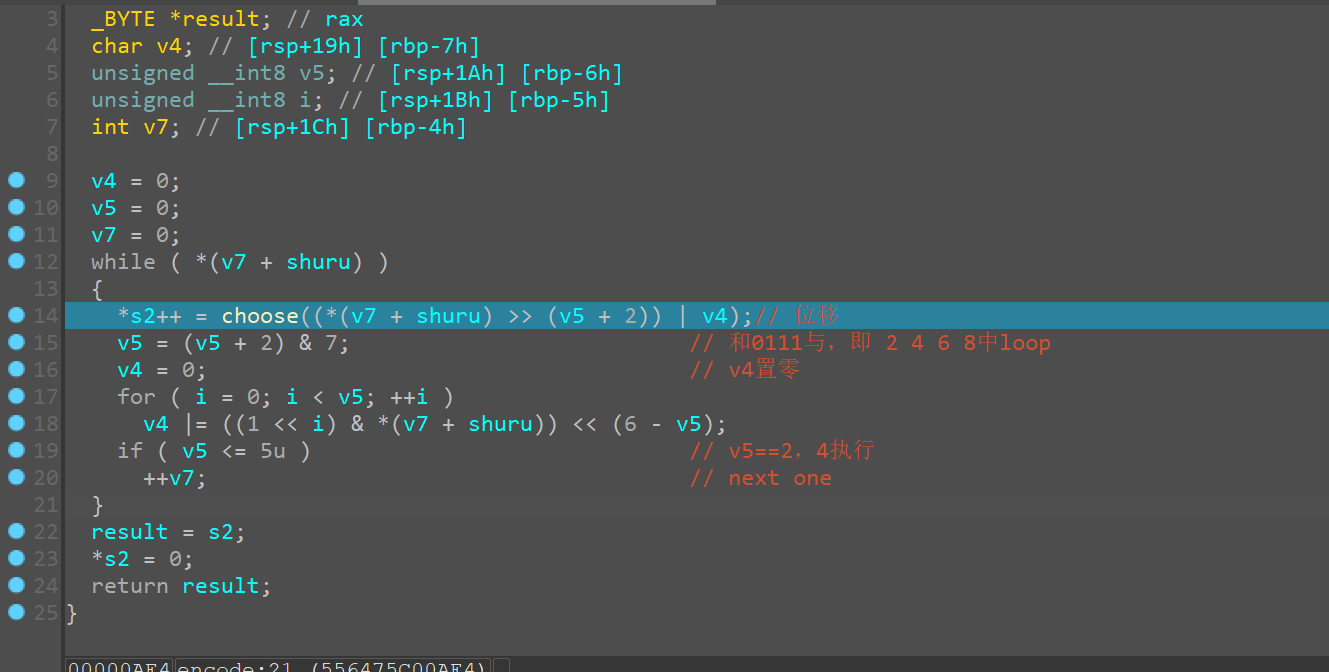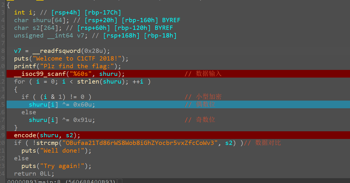 data='OBuf aa21 Td86 rWS8 Wob8 iGhZ Yocb r5vx ZfcC oWv3' data_l=list(data) base64_c='nopqrstuvwxyzabcdefghijklm0123456789ABCDEFGHIJKL+/MNOPQRSTUVWXYZ' base64_cl=list(base64_c) serial=[] for i inrange(len(data_l)): for j inrange(len(base64_cl)): if data_l[i]==base64_cl[j]: serial.append(j) ascii_list = [ ('{:0>6}').format(str(bin(i)).replace('0b', '')) for i in serial] output=[] while ascii_list: temp_list=ascii_list[:4] temp_str = ('').join(temp_list) temp_str_list = [temp_str[x:x + 8] for x in [0, 8, 16]] temp_str_list = [int(x, 2) for x in temp_str_list] for x in temp_str_list: output.append(x) ascii_list = ascii_list[4:] for i inrange(len(output)): if(i&1)!=0: output[i]^=0x60 else: output[i]^=0x91 flag=''.join(chr(x)for x in output) print(flag)