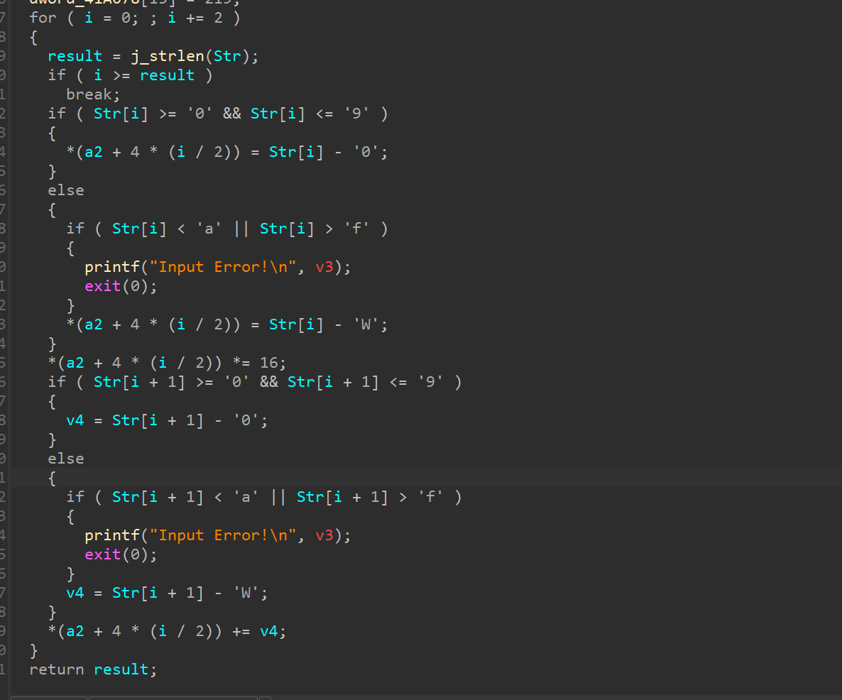 | data='fmcj2y~{' data_l=list(data) for i in range(len(data_l)): data_l[i]=ord(data_l[i]) data_l[i]-= i s=''.join(chr(i)for i in data_l) print(s) rdata=[80, 198, 241, 228, 227, 226, 154, 161 ,167,222,218,70,171,46,255,219] flag=[] for i in range(len(rdata)): rdata[i]-=1 for i in range(len(rdata)): a=int(rdata[i]/16) b=rdata[i]%16 if 9<a<16: a+=87 flag.append(chr(a)) elif 0<=a<=9: a+=48 flag.append(chr(a)) if 9<b<16: b+=87 flag.append(chr(b)) elif 0<=b<=9: b+=48 flag.append(chr(b)) flag_s=''.join(flag) print(flag_s)