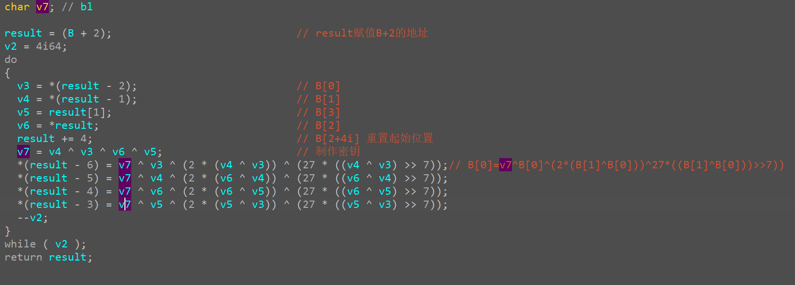 for x in range(9): for i in range(16): decode1[i] = (decode1[i] ^ string1[(9-x)*16 + i]) & 0xff decode() paixu(decode1) jiansuo(decode1) for i in range(16): decode1[i] = (decode1[i]^string1[i])&0xff flag='' for x in decode1: flag+=chr(x) print(flag)