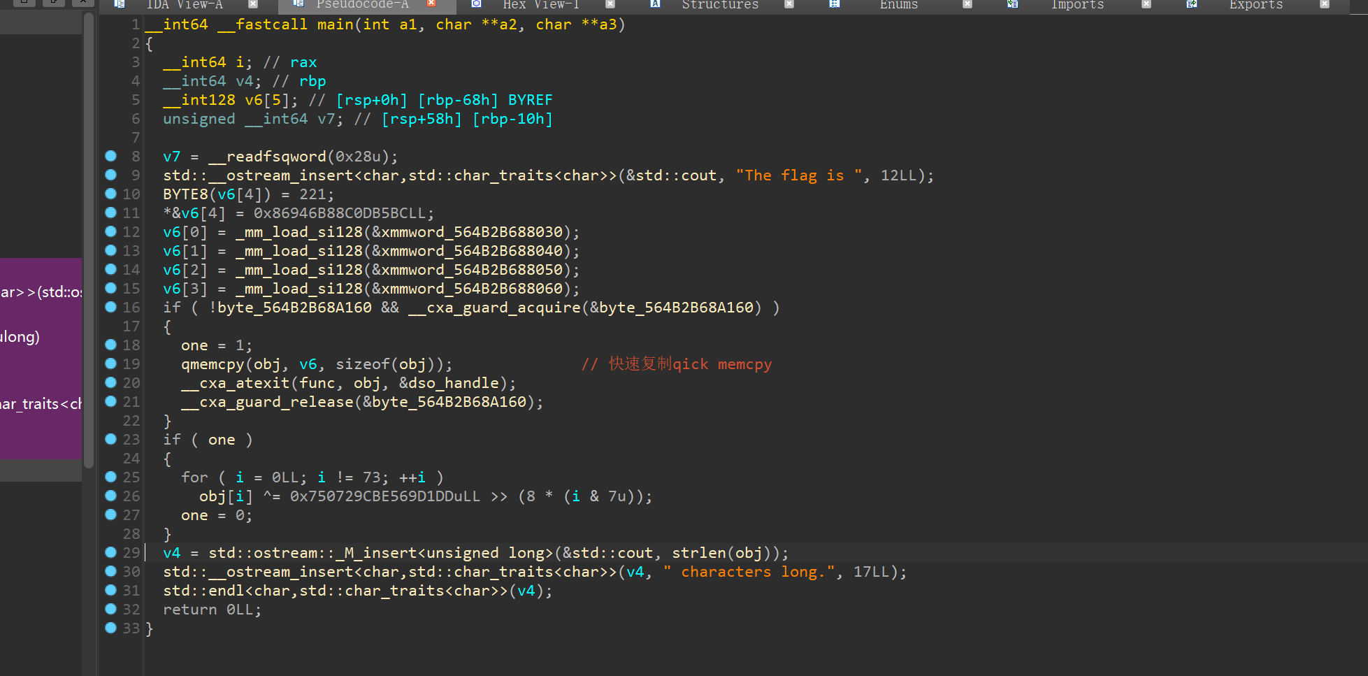 | data=[0xBA, 0xB8, 0x0E, 0x80, 0xA6, 0x52, 0x6E, 0x18, 0x82, 0xB2, 0x1C, 0x97, 0xA2, 0x46, 0x72, 0x06, 0x82, 0xB5, 0x00, 0x81, 0x94, 0x50, 0x68, 0x00, 0x82, 0xA2, 0x1D, 0x84, 0xBF, 0x40, 0x64, 0x14, 0xB1, 0xBD, 0x10, 0xBA, 0xA4, 0x5B, 0x58, 0x11, 0xA4, 0xBF, 0x08, 0x88, 0xA2, 0x4A, 0x66, 0x19, 0xB1, 0xA8, 0x36, 0x97, 0xAE, 0x5F, 0x62, 0x07, 0xAE, 0xB4, 0x36, 0x95, 0xA2, 0x47, 0x60, 0x2A, 0xBC, 0xB5, 0x0D, 0x8C, 0xB8, 0x46, 0x69, 0x08, 0xDD] for i in range(73): data[i]=(data[i]^ 0x750729CBE569D1DD >> (8 * (i & 7)))&0xff flag=''.join(chr(i)for i in data) print(flag)