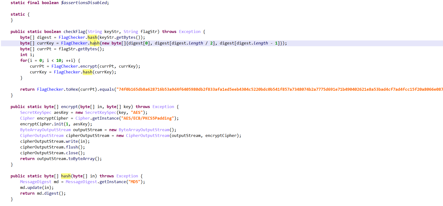 | import java.io.ByteArrayOutputStream; import java.security.MessageDigest; import javax.crypto.Cipher; import javax.crypto.CipherOutputStream; import javax.crypto.spec.SecretKeySpec; public class n15decode { public static void main(String[] args) throws Exception { String data = "74f0b165db8a628716b53a9d4f6405980db2f833afa1ed5eeb4304c5220bdc0b541f857a7348074b2a7775d691e71b4904026" + "21e8a53bad4cf7ad4fcc15f20a8066e087fc1b2ffb21c27463b5737e34738a6244e1630d8fa1bf4f38b7e71d707425c8225f240f4bd2b" + "03d6c2471e900b75154eb6f9dfbdf5a4eca9de5163f9b3ee82959f166924e8ad5f1d744c51416a1db89638bb4d1411aa1b1307d88c1fb5"; for (char i = 255; i > 1; i--) { for (char j = 255; j > 0; j--) { for (char k = 255; k > 0; k--) { byte [] byte_key1 = {(byte) i, (byte) j, (byte) k}; byte [] flag = bytelize(data); for(int a = 10; a> 0 ;a--) { byte[] byte_key2 = hash(byte_key1); for(int b = 0; b < a-1; b++) { byte_key2 = hash(byte_key2); } flag = decrypt(flag, byte_key2); } int bool = 0; for (int c=0; c< flag.length;c++) { if(flag[0]<127 & flag[0]>32 & flag[1]<127 & flag[1]>32 & flag[2]<127 & flag[2]>32 &flag[c]=='{') { bool = 1; break; } } if(bool==1) { System.out.println(new String(flag,"utf-8"));} } } }
