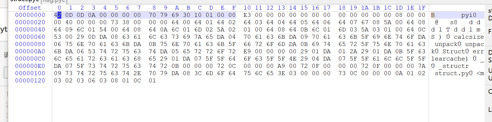 完成之后将文件夹内的struct.pyc 前十六个字节copy到产出的pyc内,E3 前的是文件头。抄过去