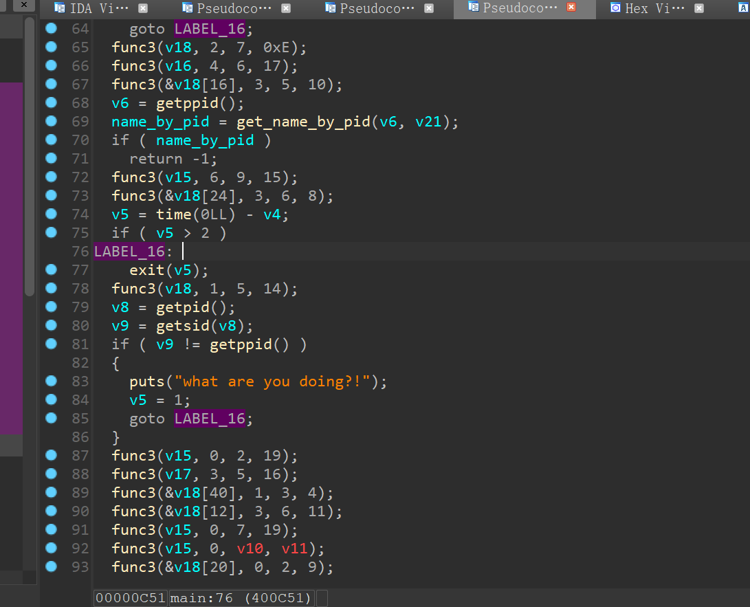 把这些getpid 识别进程,跳转exit的反调试用idapy ,还有一些会导致奇怪循环的字节nop掉,