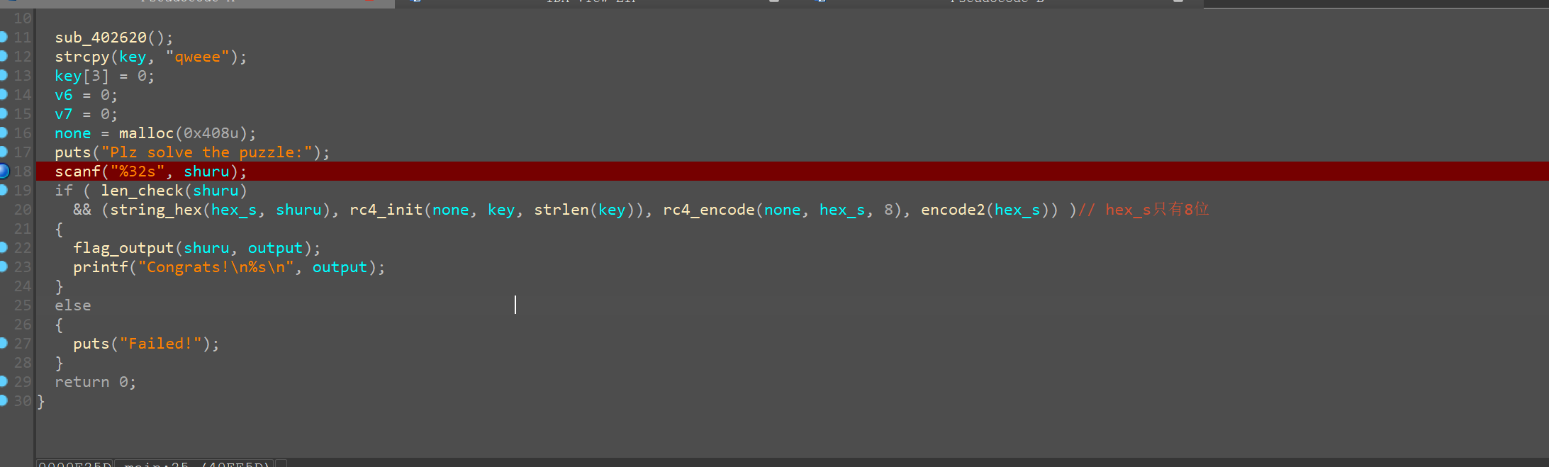 int result = 0; do { switch (*a1) { case0: b1 &= b2; b3 *= b1; break; case1: if (!b3) return0; b1 /= b3; b4 += b5; break; case2: b6 ^= b5; b7 += b8; break; case3: b7 -= b6; b6 &= b4; break; case4: b5 *= b8; b3 -= b2; break; case5: b8 ^= b3; b2 -= b7; break; case6: if (!b7) return0; b5 |= b4 / b7; b4 /= b7; break; case7: b2 += b1; b5 |= b4; break; case8: b8 *= b3; b6 -= b7; break; case9: b1 += b5; b3 ^= b6; break; default: return0; } ++a1; ++i; } while (i<8); result =(((b2 == 0xE7) + (b5 == 0x3878) + (b6 == 0x3A71) + (b3 == 0xFFFFCC30) + (b1 == 0x10) + (b4 == 0x68) + (b8 == 0xFFFFFC49)) == 7); if (b7 != 0xFFFFFF11) return0; return result; } intmain() { int a, b, c, d, e, f, g, h ; int test[8] = {}; for (a=0; a < 10; a++) { for (b = 0; b < 10; b++) { for (c = 0; c < 10; c++) { for (d = 0; d < 10; d++) { for (e = 0; e < 10; e++) { for (f = 0; f < 10; f++) { for (g = 0; g < 10; g++) { for (h = 0; h < 10; h++) { test[0] = h; test[1] = g; test[2] = f; test[3] = e; test[4] = d; test[5] = c; test[6] = b; test[7] = a; if (check(test)) { printf("好耶,%d%d%d%d%d%d%d%d",h,g,f,e,d,c,b,a); }