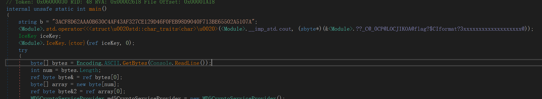 然后和string b 比较(b=”3ACF8D62AAA0B630C4AF43AF327CE129D46F0FEB98D9040F713BE65502A5107A”)