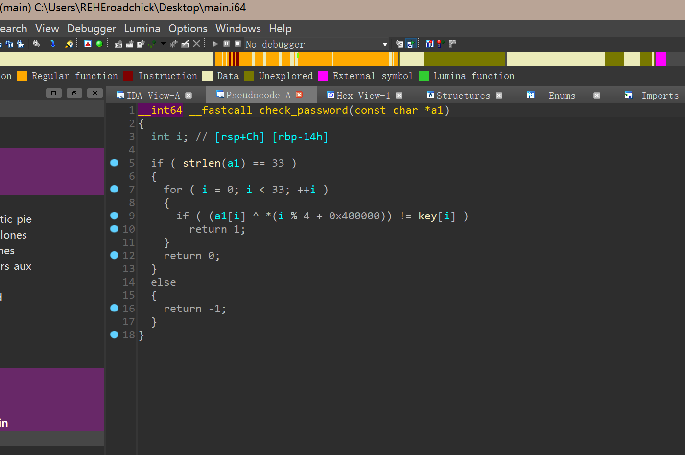 ; Function Attrs: noinline nounwind optnone uwtable define dso_local i32 @check_password(i8* %0) #0 { %2 = alloca i32, align 4 %3 = alloca i8*, align 8 %4 = alloca i32, align 4 store i8* %0, i8** %3, align 8 %5 = load i8*, i8** %3, align 8 %6 = call i64 @strlen(i8* %5) #3 %7 = icmp ne i64 %6, 33 br i1 %7, label %8, label %9