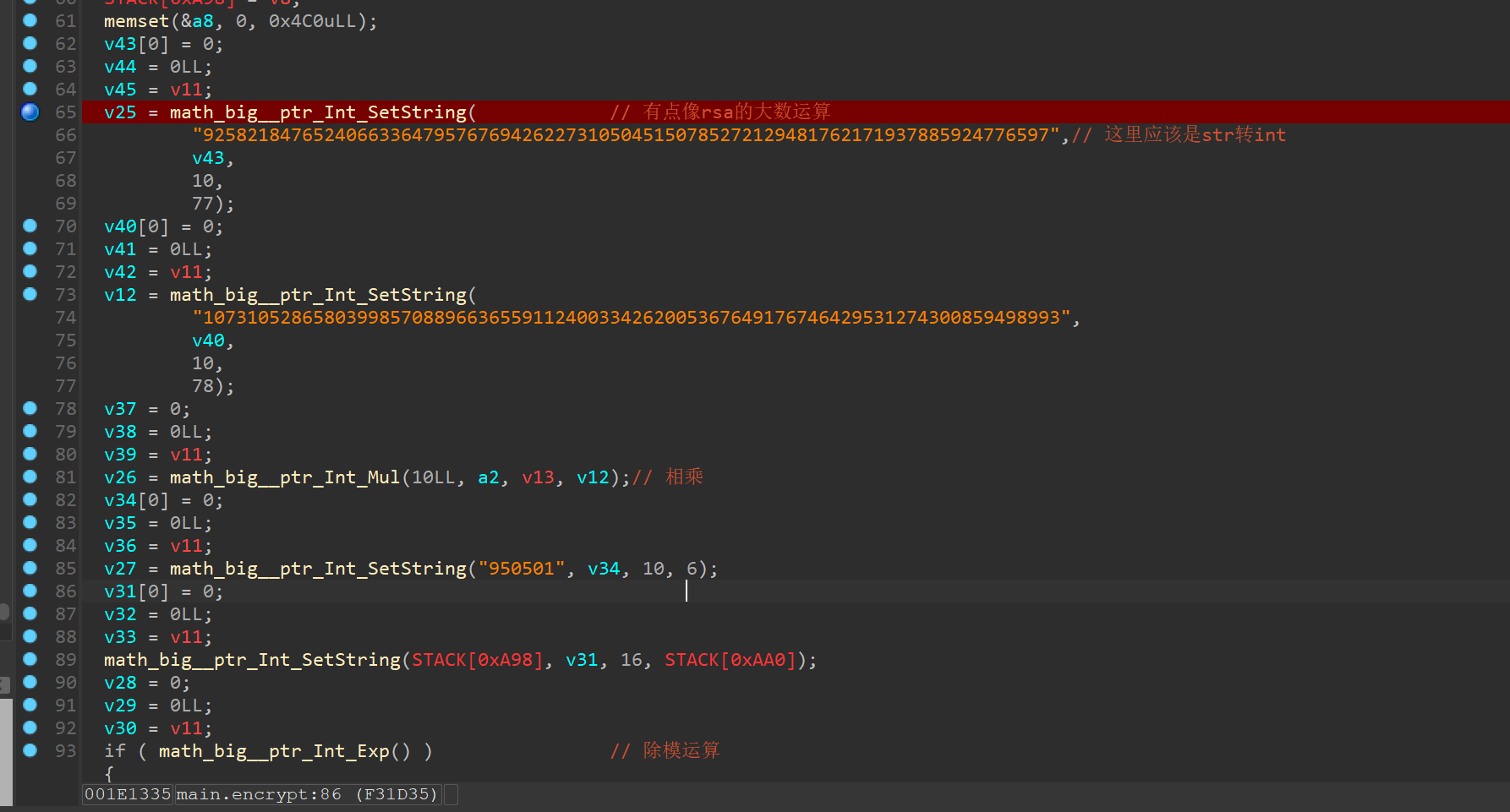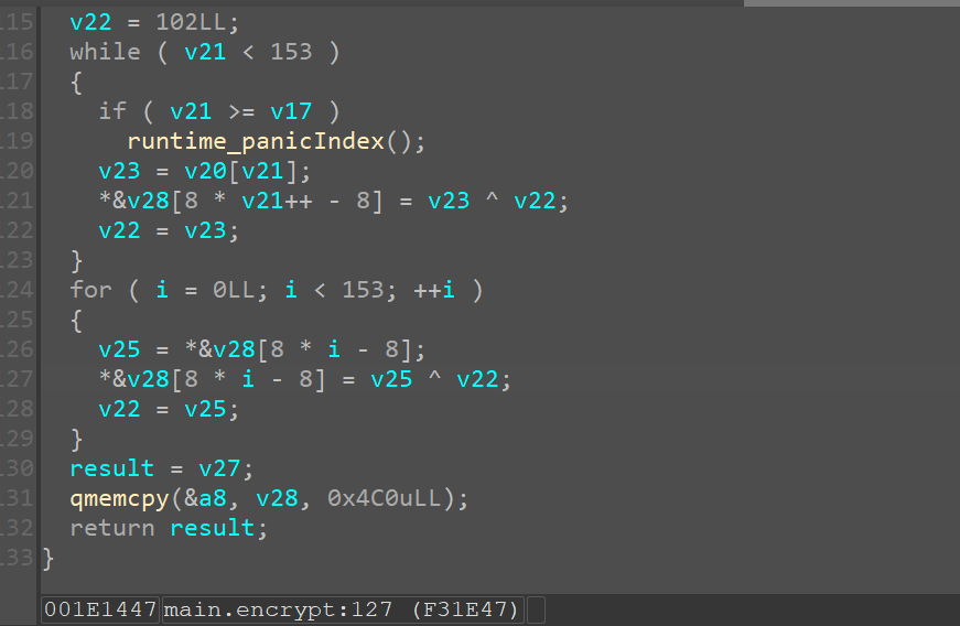 for j in range(40,56): tmp=j tmp ^= 0x66 cct=[i for i in data] for i in range(0,153,2): cct[i] ^= tmp tmp = cct[i] a=bytes(cct) print(a) enc=135005562109829034199059149474896341566307600227148289525068532297727897409776873250963225670468340868270979975367474527115512003915945795967599087720024 d=gmpy2.invert(e,(p-1)*(q-1)) m=pow(enc,d,n) print(long_to_bytes(m))