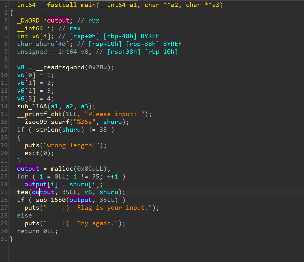 int main() { unsigned int data[35] = { 0xE74EB323, 0xB7A72836, 0x59CA6FE2, 0x967CC5C1, 0xE7802674, 0x3D2D54E6, 0x8A9D0356, 0x99DCC39C, 0x7026D8ED, 0x6A33FDAD, 0xF496550A, 0x5C9C6F9E, 0x1BE5D04C, 0x6723AE17, 0x5270A5C2, 0xAC42130A, 0x84BE67B2, 0x705CC779, 0x5C513D98, 0xFB36DA2D, 0x22179645, 0x5CE3529D, 0xD189E1FB, 0xE85BD489, 0x73C8D11F, 0x54B5C196, 0xB67CB490, 0x2117E4CA, 0x9DE3F994, 0x2F5AA1AA, 0xA7E801FD, 0xC30D6EAB, 0x1BADDC9C, 0x3453B04A, 0x92A406F9 }; uint32_t const k[4] = { 1,2,3,4 }; int n = 35; btea(data, n, k); for (int i = 0; i <= 34; i++) { printf("%c", (char)data[i]); } return 0; }
