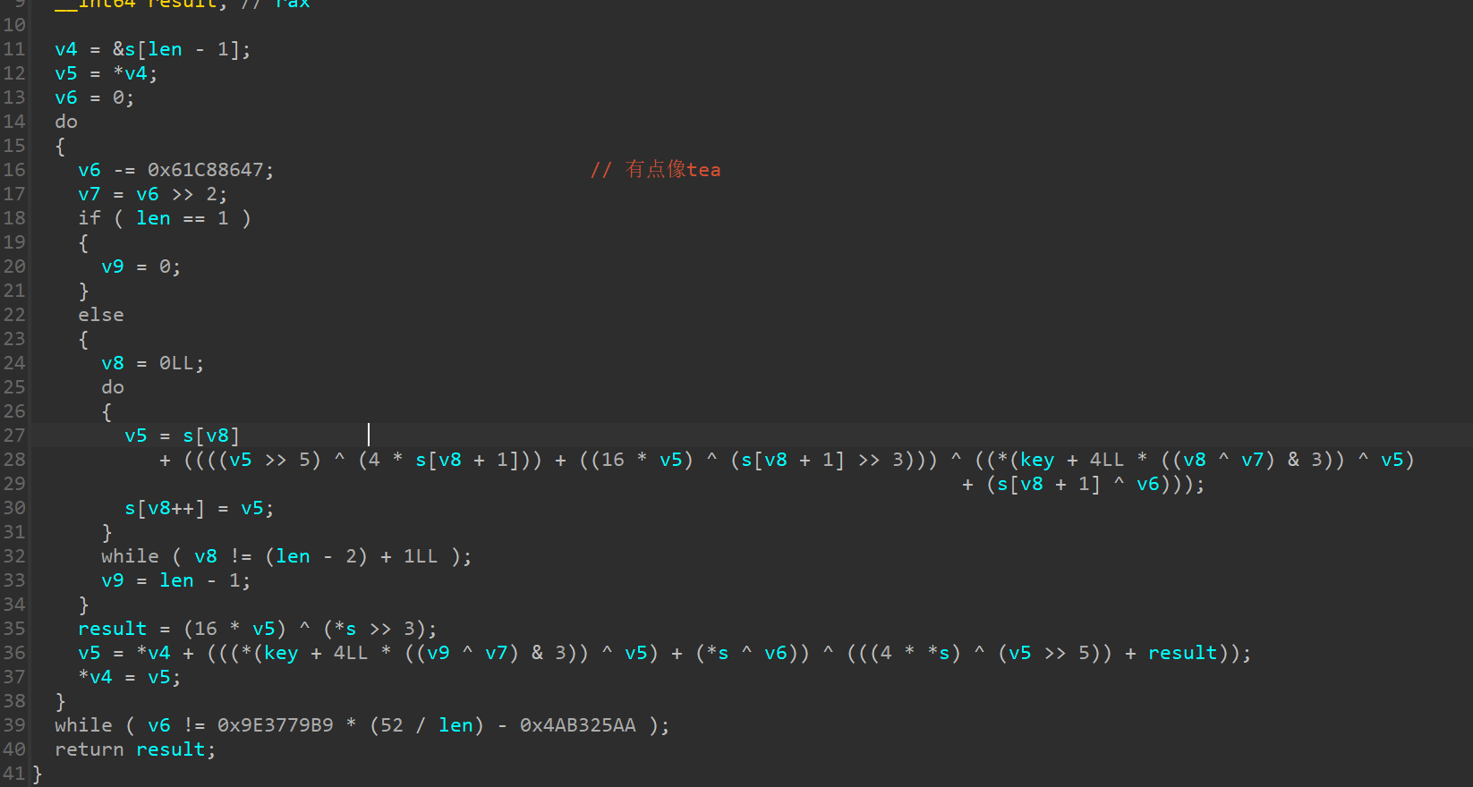 rounds = 6 + 52 / n; sum = 0x9E3779B9 * (52 / n) - 0x4AB325AA; y = v[0]; do { e = (sum >> 2) & 3; for (p = n - 1; p > 0; p--) { z = v[p - 1]; //环形加密,加密data[len-1]需要data[0]作为y,data[len-2]作为z y = v[p] -= MX; } z = v[n - 1]; y = v[0] -= MX; sum += DELTA; } while (--rounds); }
