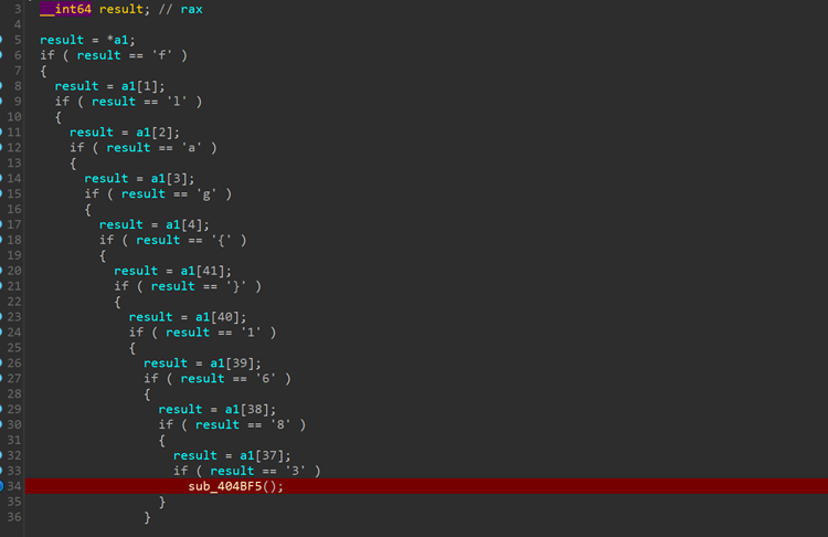 得到flag的头部和尾部,跟进 sub_404BF5,但是函数内部看不出什么东西, 回来看看汇编
