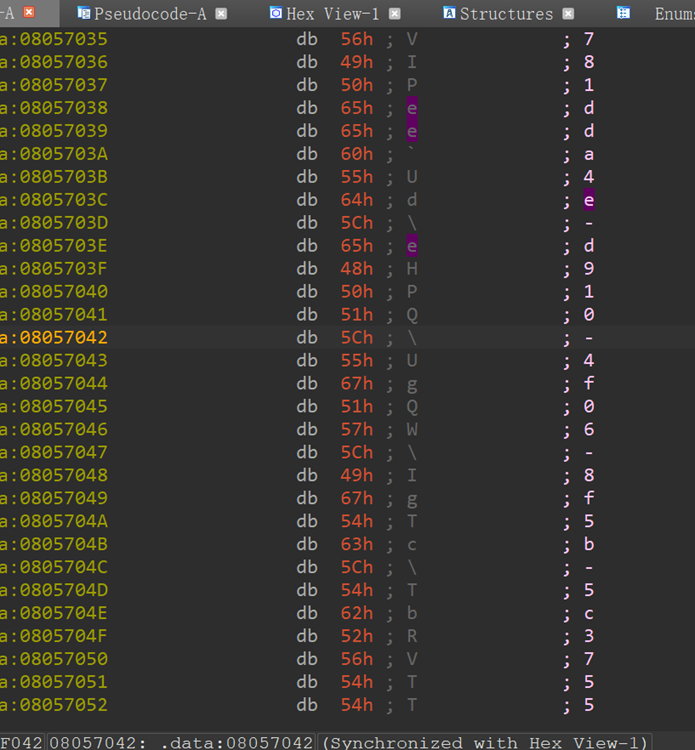 Put的位置 然后发现输入和输出是一一对应的。密文在data段内。 这题就可以结束了。 用subproseess或者pwntools都可以爆破。不过我写的时候时间比较紧张,直接手搓了